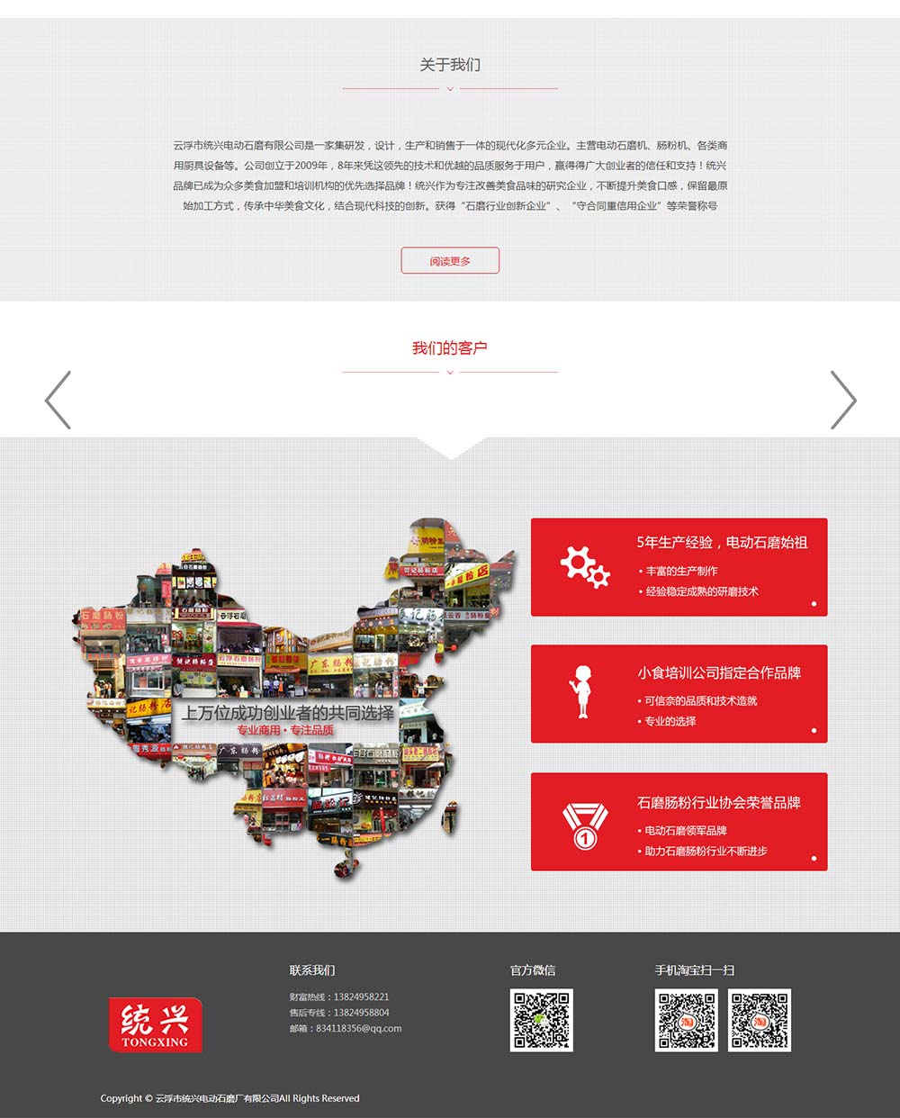 云浮市统兴电动石磨有限公司是一家市(省)定点生产电动石磨的专业工厂,已有十多年生产制造经验,是省级先进企业,省级安全生产企业,市级标准化先进企业,市级重合同,守信誉单位。自创业以来,一直秉持为客户提供优质电动石磨、肠粉机等商用厨电的理念,以精益求精、兢兢业业的态度,不断创新生产技术和工艺,并建立和完善一套集采购、检测、制程质控和售后跟踪的严格有效管理模式。厂区占地11000多平米,设有设计部、研发技术部、生产部、营销部等。现在职工186人,本科以上技术管理专业人才60人。我司主要产品有:电动石磨机、肠粉机、高压肠粉炉等。我司生产的业内第一款电动升降石磨,已销往全球30多个国家,国内经销商达200多家,让产品售后无忧。欢迎广大新老客户前来参观了解!
