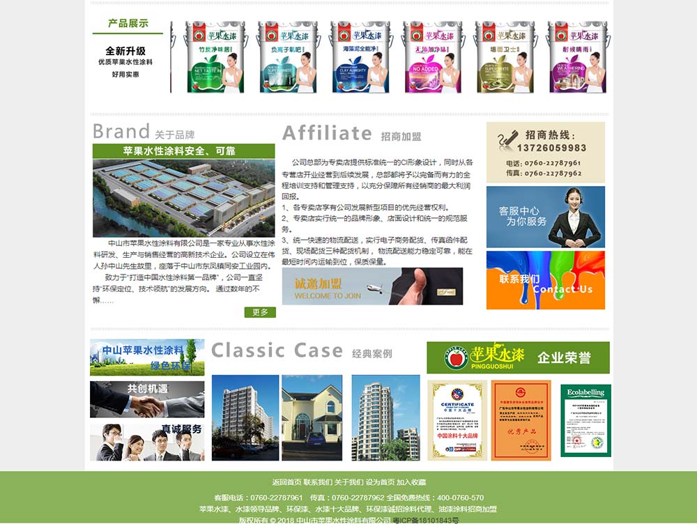 公司自成立以来,秉承着“健康生活,环保事业”的企业使命,“立人为本,科技创新”的核心价值观,“和谐、发展、共嬴、快乐”的文化和理念,实行“加工生产、产品销售、现场施工、技术支持和售后服务”一条龙经营模式。以诚信换市场,以科技创品牌,中山市苹果水性涂料有限公司始终把消费者满意程度放在首位,立志把最环保最优质的涂料产品奉献给千家万户。