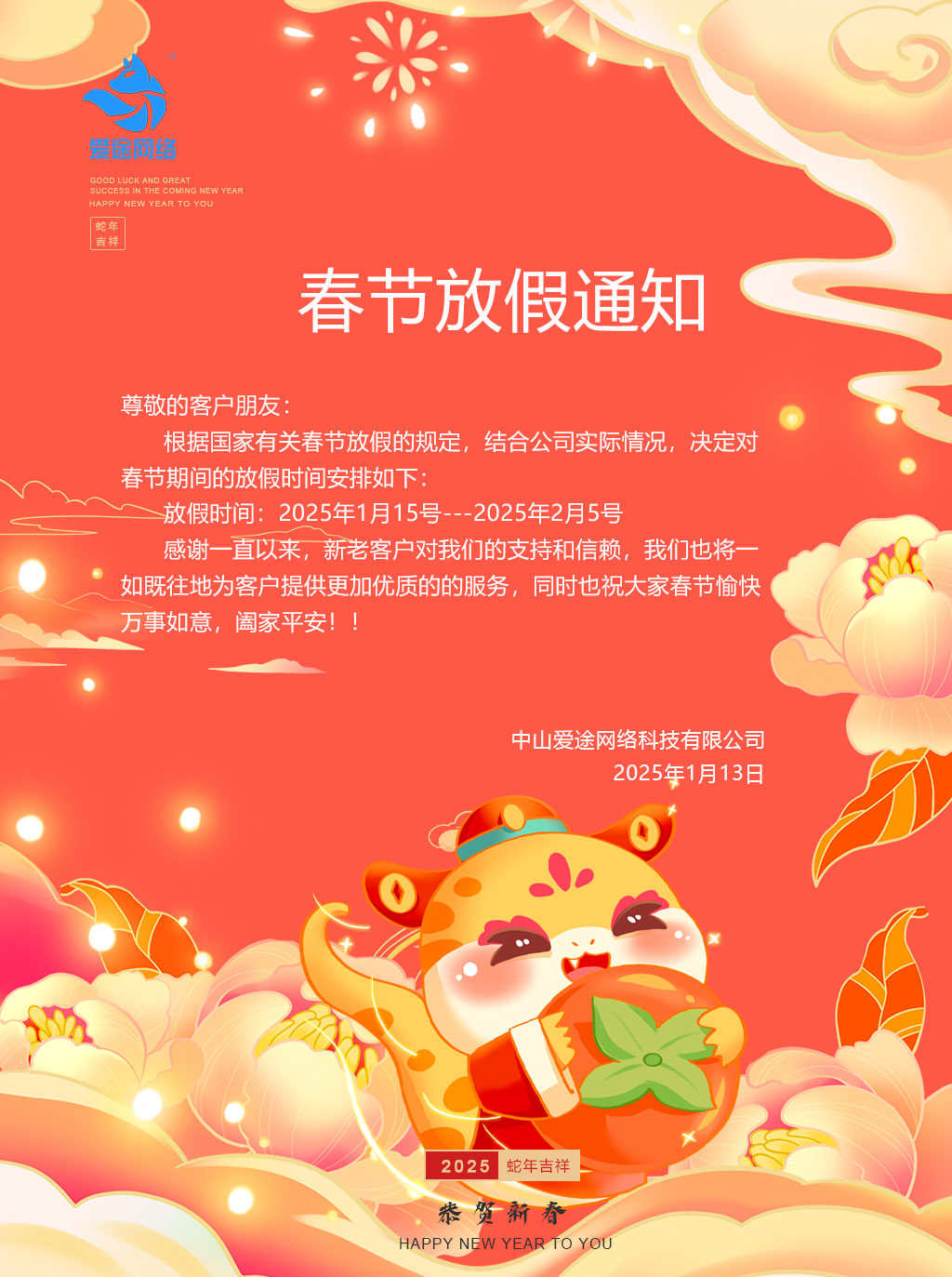 根据国家有关春节放假的规定,结合公司实际情况,决定对春节期间的放假时间安排如下: 放假时间:2025年1月15号---2025年2月5号 感谢一直以来,新老客户对我们的支持和信赖,我们也将一如既往地为客户提供更加优质的的服务,同时也祝大家春节愉快,万事如意,阖家平安!!
