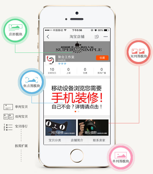 2015年11月,手机淘宝交易额约占整体成交额80.24%,目前淘宝已经大手笔退出了若干项扶持政策,力推手机淘宝!大背景下,单独定制手机版详情页至关重要。聚合工作室“贴合”定制化设计最优搭配,在有效的篇幅内最大限度优化展现产品卖点促成交易!“创造”4大黄金要点:了解分析、店铺定位、规划设计、完美呈现。成就最佳创意属于您自己的电商,要的就是独一无二!