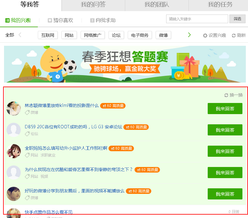 4、在设置好兴趣后,你的帐号下面就出来很多和你设置的兴趣关键词有关的问题了,你需要做的就是挨个去回答这些问题,这些回答才是影响增粉量的最关键因素。